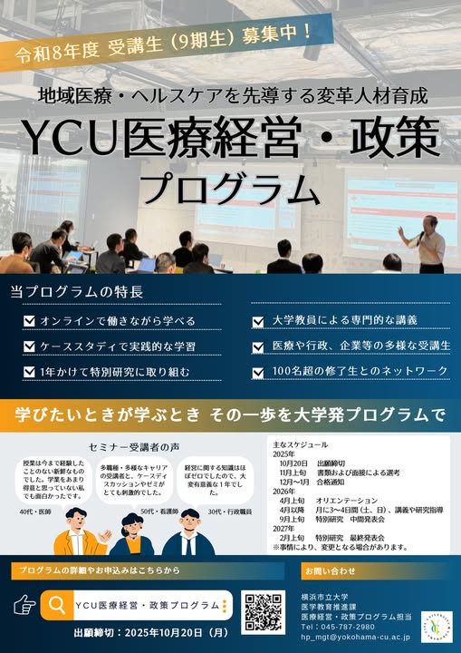弊社松村も講師陣に加わる横浜市立大学『医療経営・政策プログラム』の2026年度生の募集が開始されます。