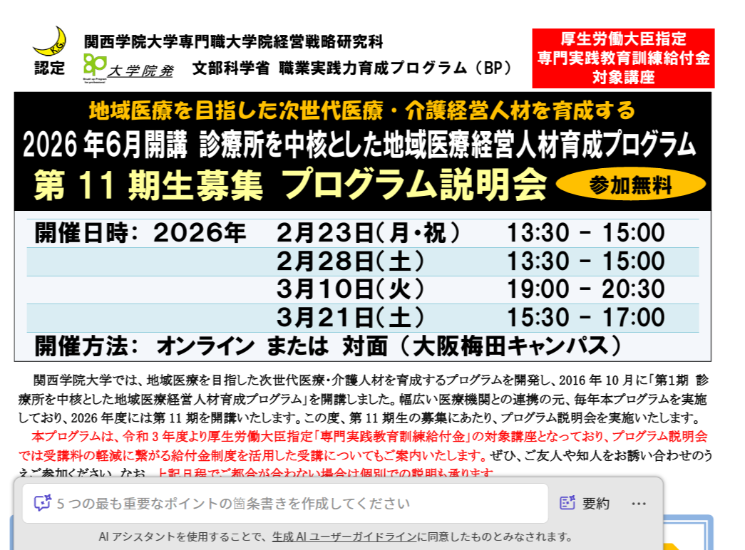 関西学院大学の診療所を中心とした医療経営人材プログラム10期生の募集です。